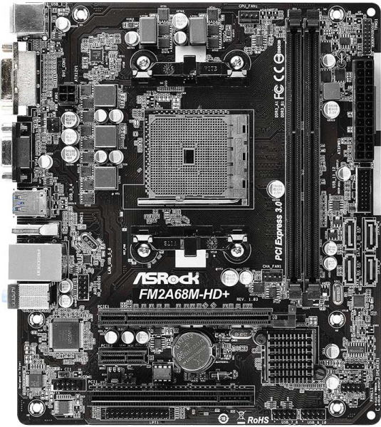 Материнская плата ASROCK FM2A68M-HD+ AMD A68H, FM2+, DDR3, PCI, 2*PCI-E, 4*SATA II RAID, VGA, DVI, HDMI, 10*USB2.0, PS/2, GLAN, mATX, Retail