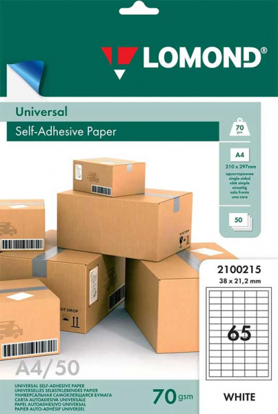 Бумага самоклеящаяся универсальная LOMOND, матовая, A4, 70 г/м2, деленная, 65 этикеток (21.2 x 38.0) на лист, белая, 50 л.