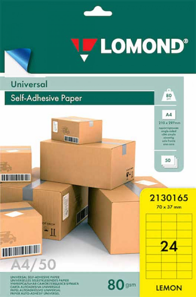 Бумага самоклеящаяся цветная универсальная LOMOND, матовая, A4, 80 г/м2, деленная, 24 этикетки (70.0 x 37.0) на лист, лимонно-желтая, 50 л.