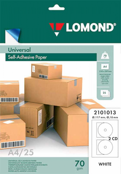 Бумага самоклеящаяся универсальная LOMOND, матовая, A4, 70 г/м2, деленная, 2 этикетки (D=117 (круглые)) на лист, белая, 50 л.